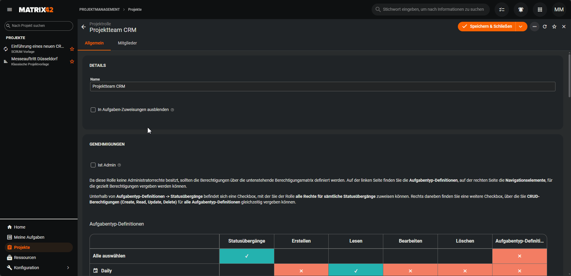 Für jede Projektrolle können folgende Attribute und Berechtigungen gepflegt werden: