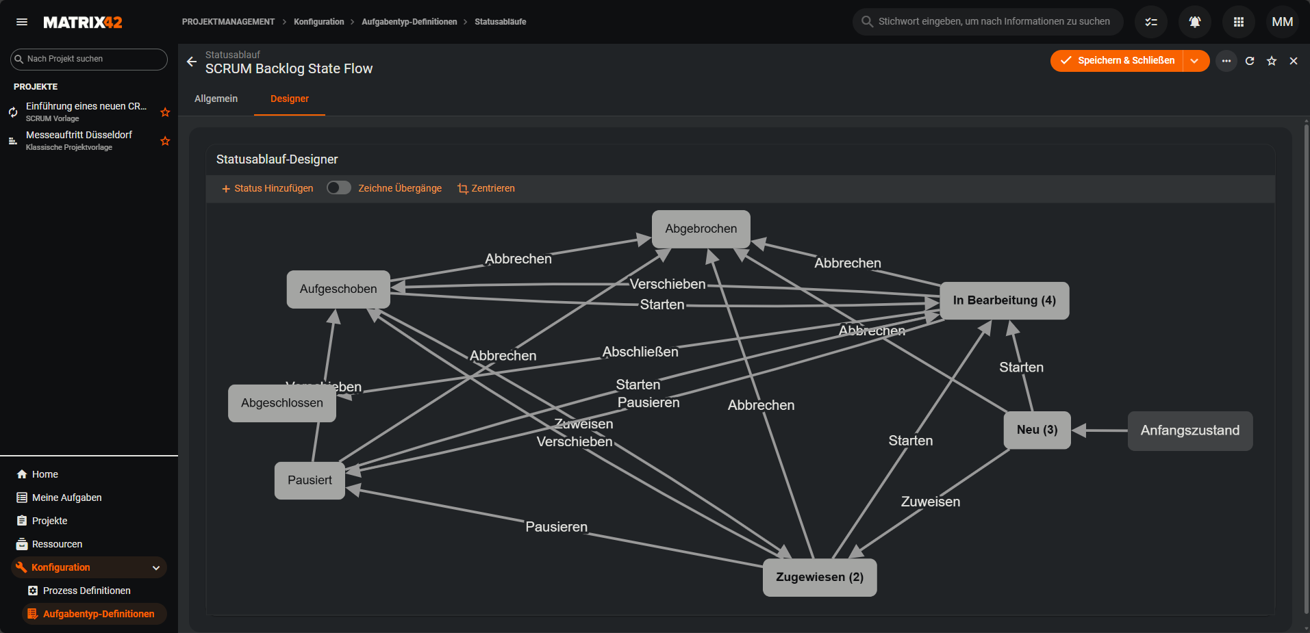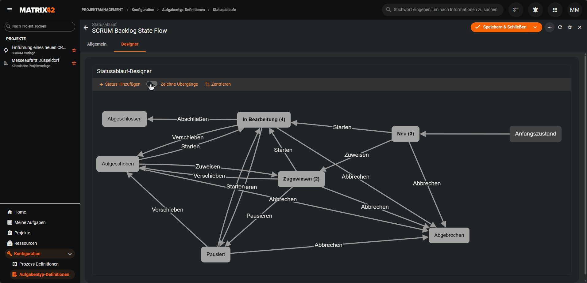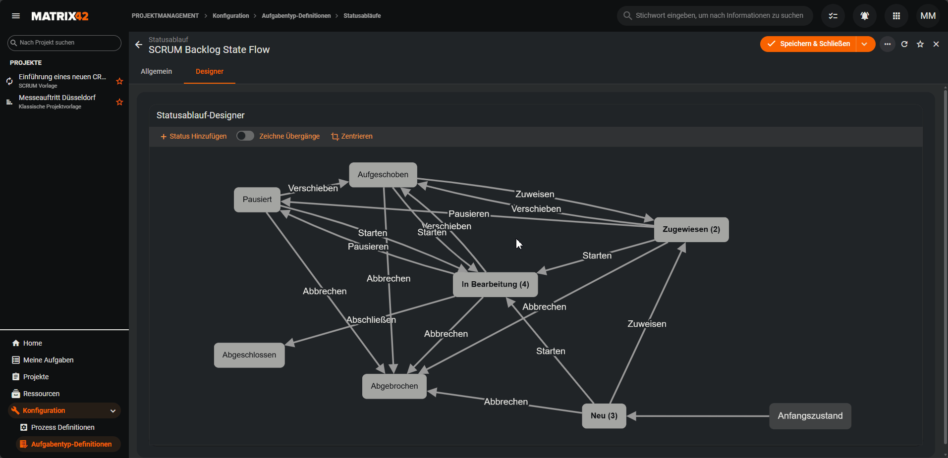 Die hier hinterlegten Status stehen anschließend im Statusablauf-Designer zur Verfügung und können dort über Übergänge miteinander verbunden werden.