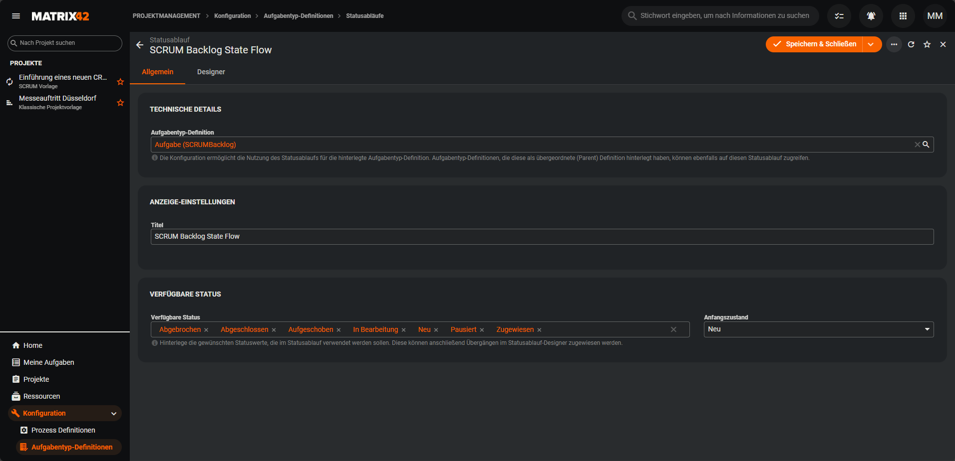 In diesem Bereich werden alle Status definiert, die im Statusablauf verwendet werden dürfen (z. B. Neu, In Bearbeitung, Pausiert, Abgeschlossen).