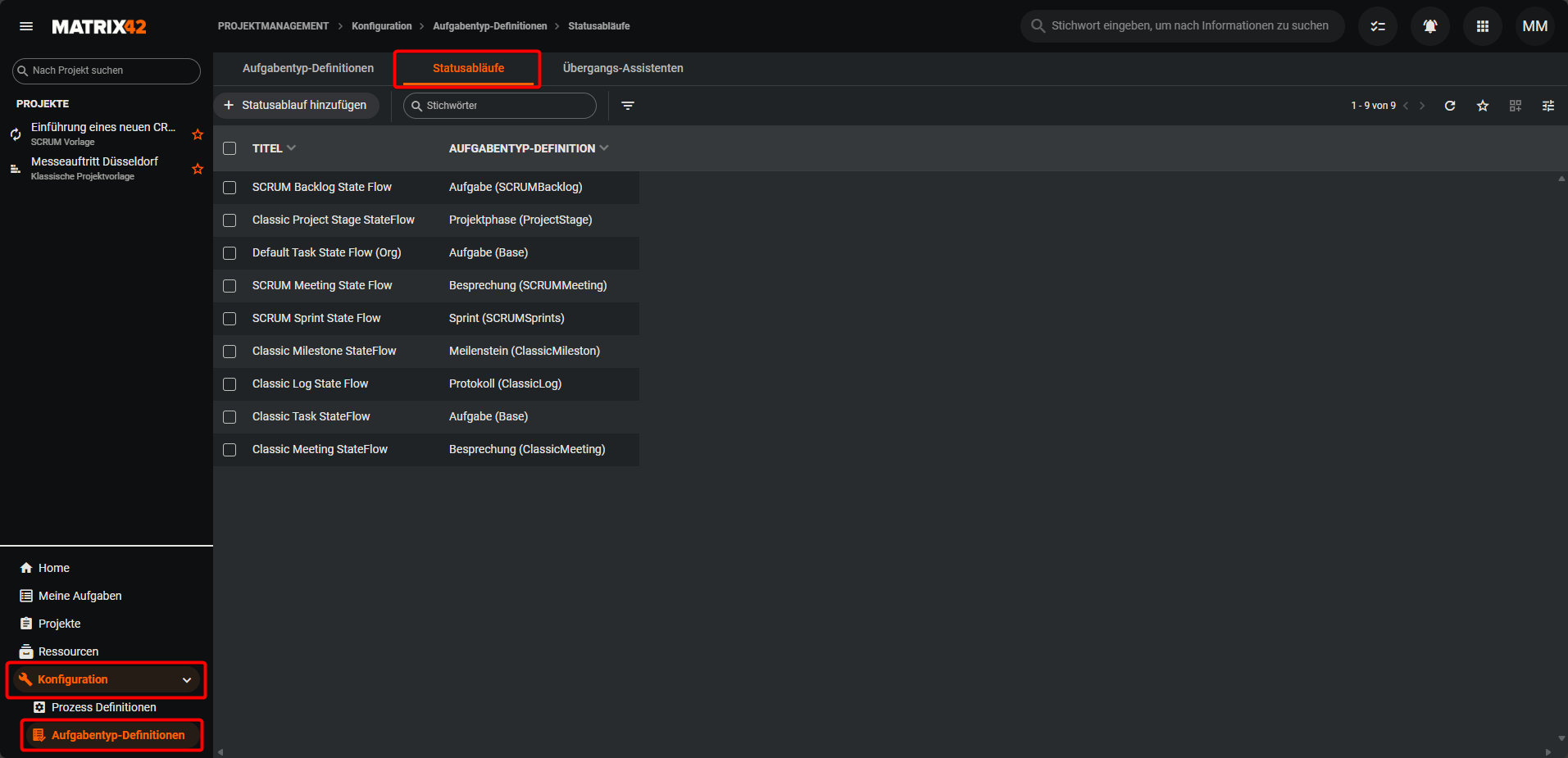 Standardmäßig werden mit dem Project Management mehrere Statusabläufe ausgeliefert.