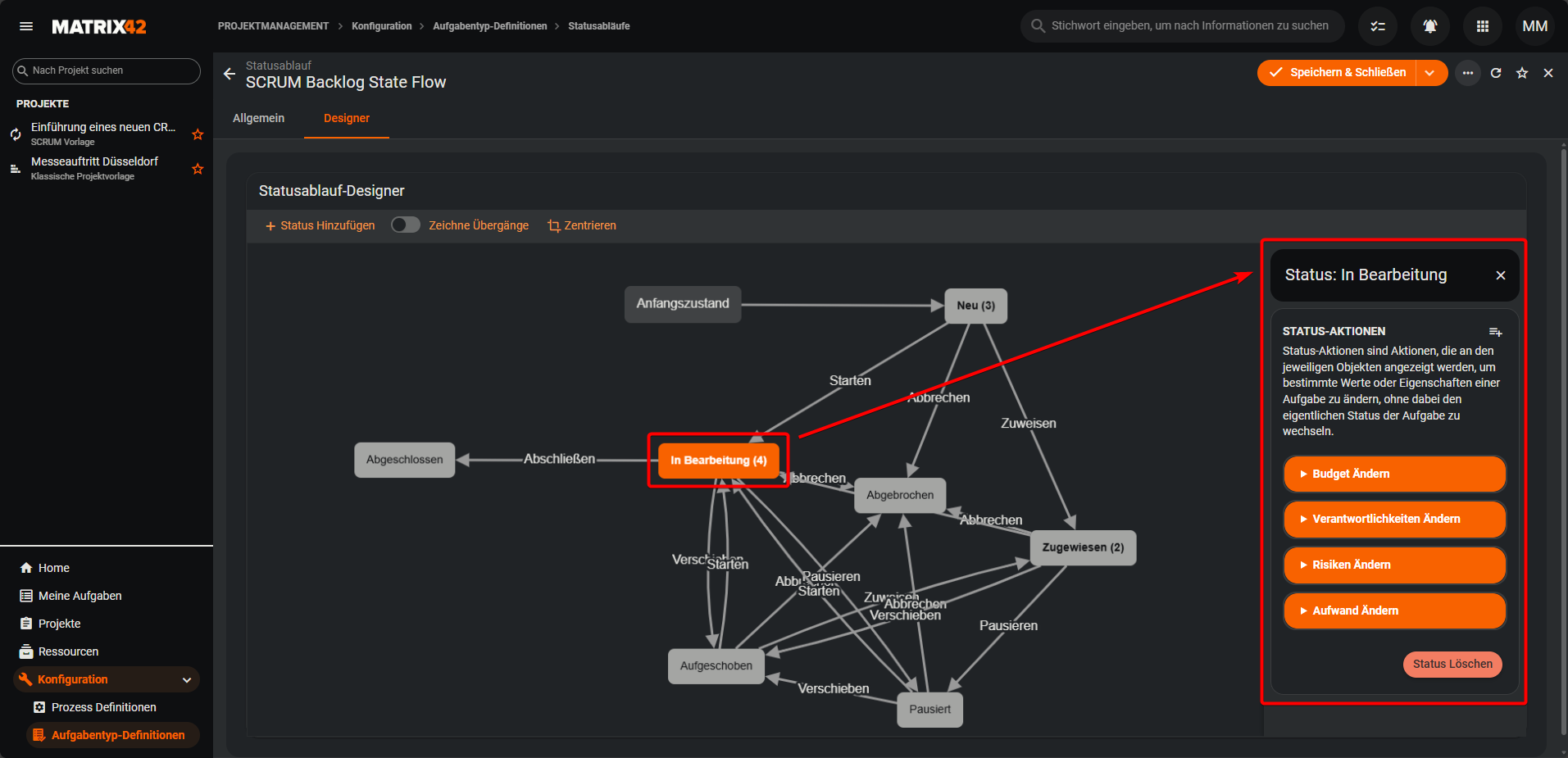 Durch einen Klick auf einen Status öffnet sich auf der rechten Seite das Konfigurationspanel für den Status und die zugehörigen Status-Aktionen.