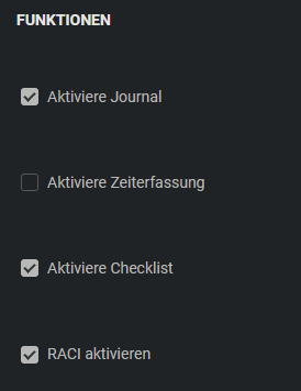 In diesem Bereich können optionale Funktionen für die Aufgabentyp-Definition aktiviert werden. Zur Verfügung stehen: