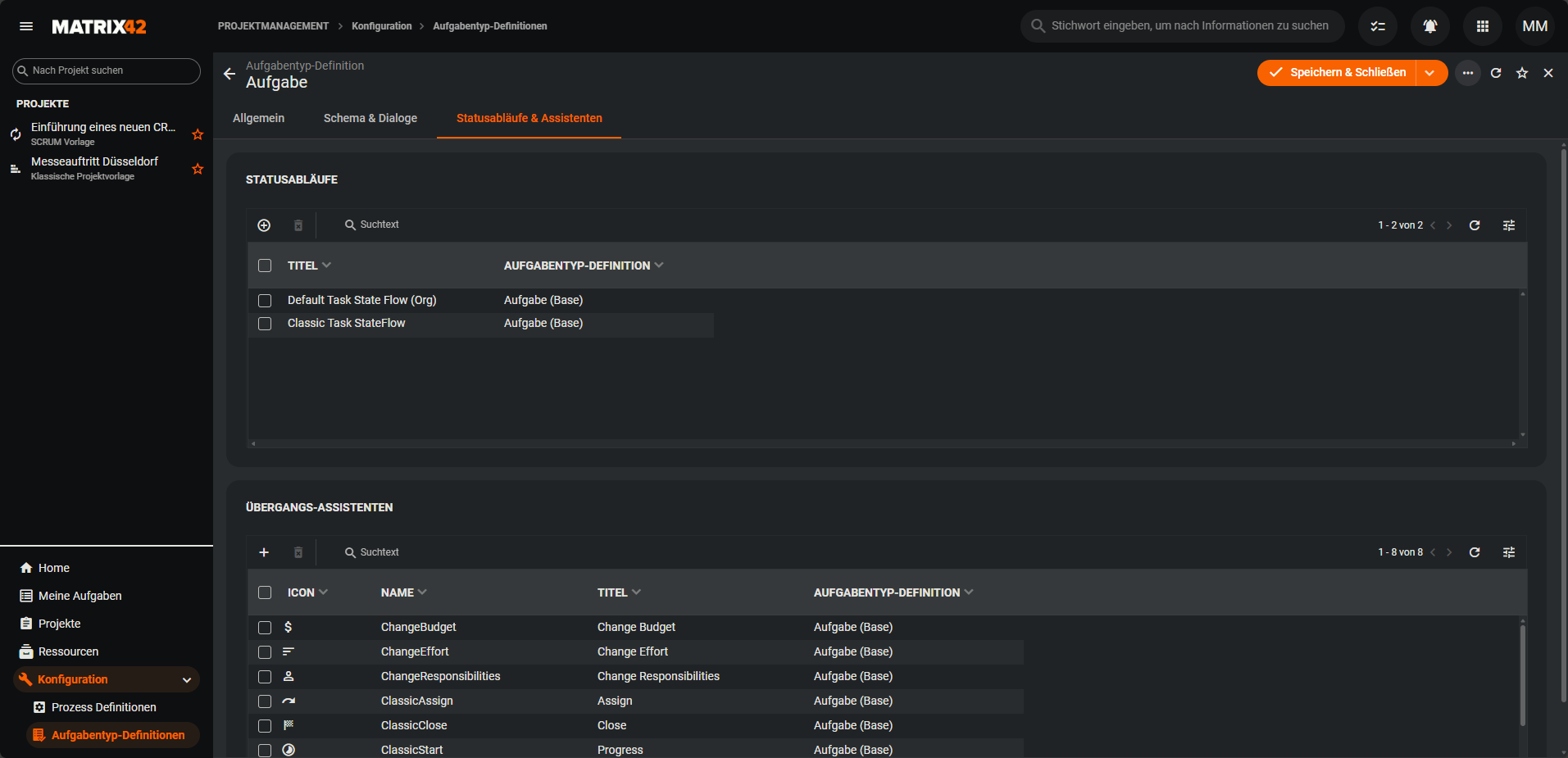 In der Ansicht Statusabläufe & Assistenten werden alle Statusabläufe sowie die zugehörigen Übergangs-Assistenten angezeigt, die direkt der jeweiligen Aufgabentyp-Definition zugeordnet sind.
