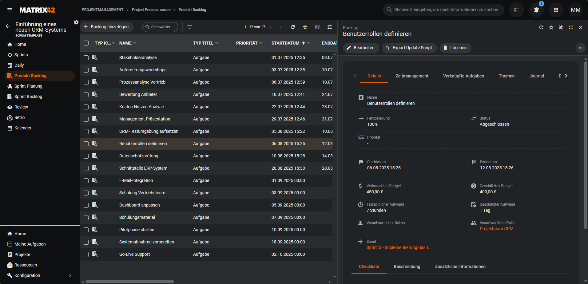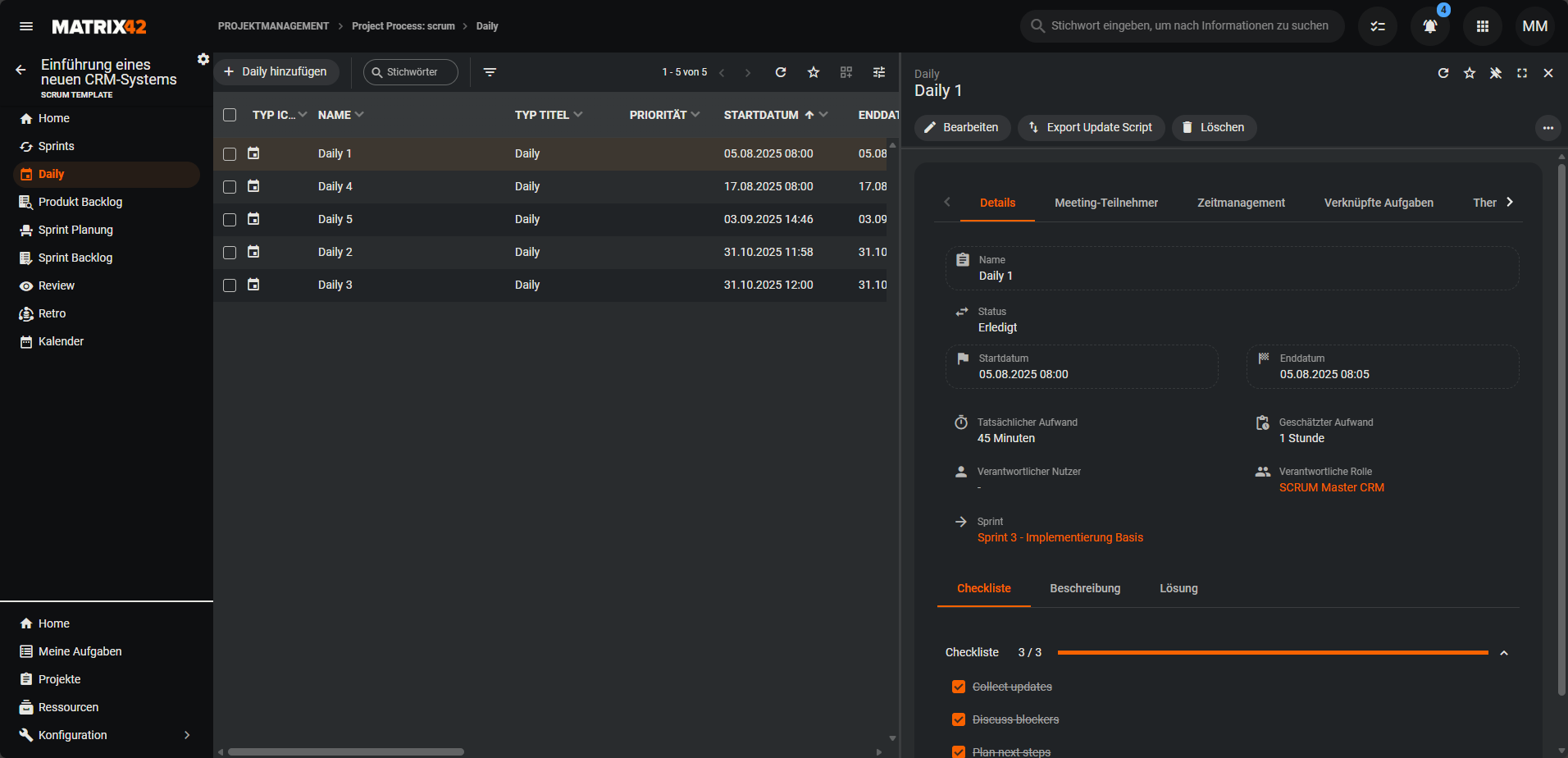 SCRUMDaily), Review (SCRUMReview), Sprint Planung (SCRUMSprintPlan), Retro (SCRUMRetro) - Für Aufgabendefinition: Besprechung (
