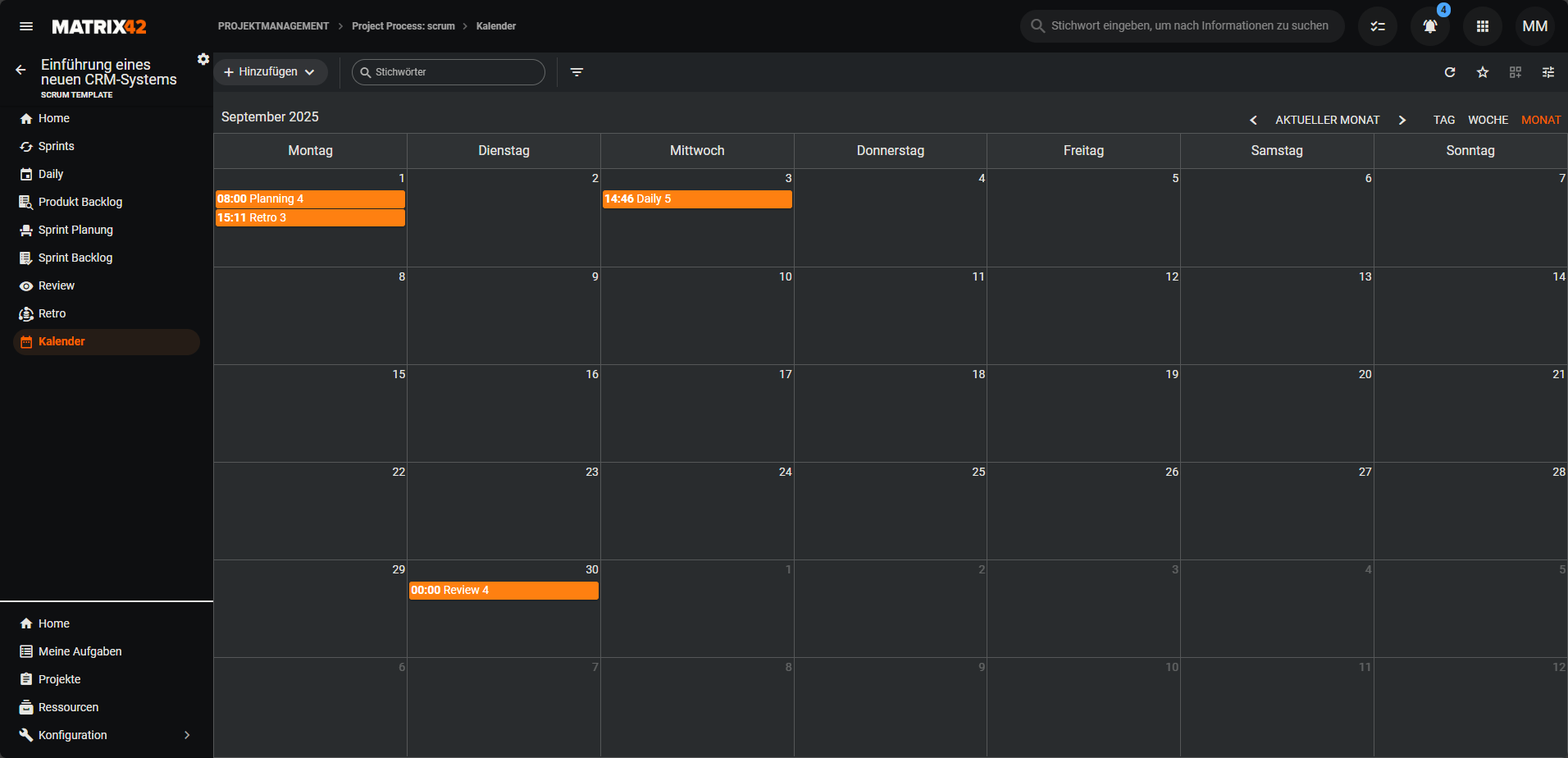 Im Navigationselement Kalender findest du alle Besprechungen vom Typ Sprint, Daily, Sprint Planung, Review und Retro innerhalb des Projekts. Die Besprechungen werden in einer Kalenderansicht dargestellt.