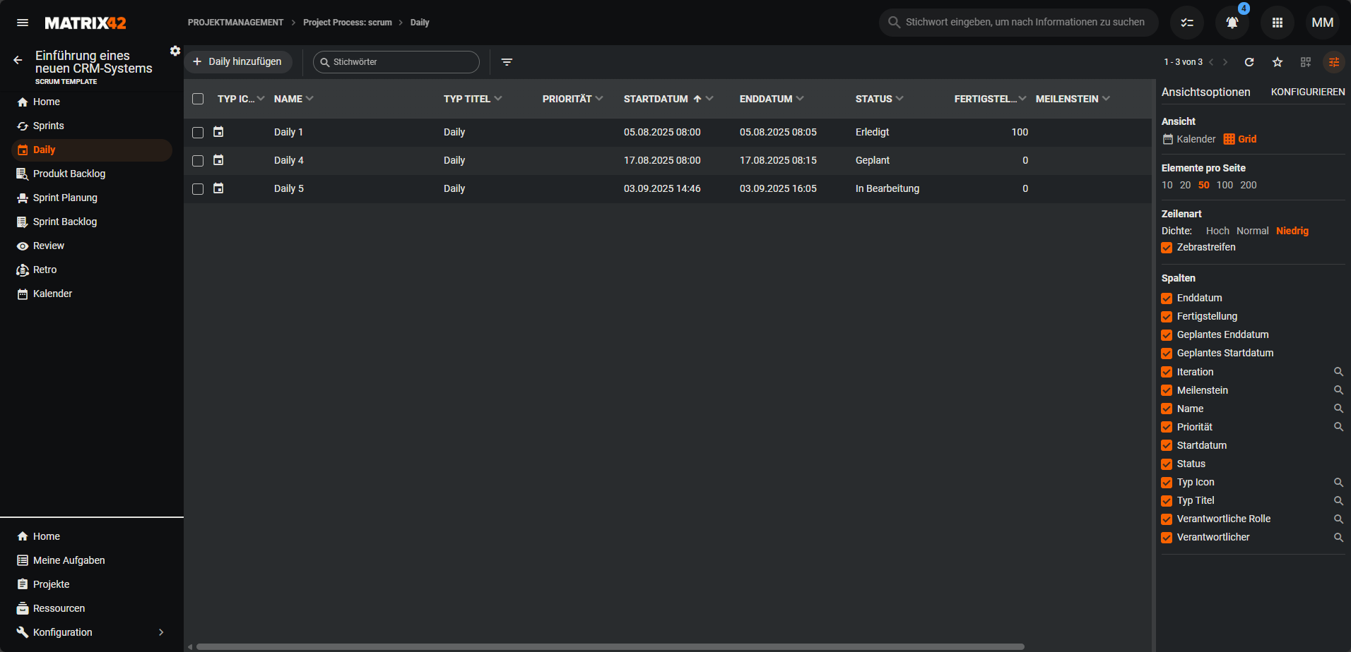 Unter Daily findest du alle Dailies innerhalb des Projekts. Du kannst zwischen den Anzeigeoptionen tabellarische Grid-Ansicht und Kalenderansicht wechseln.