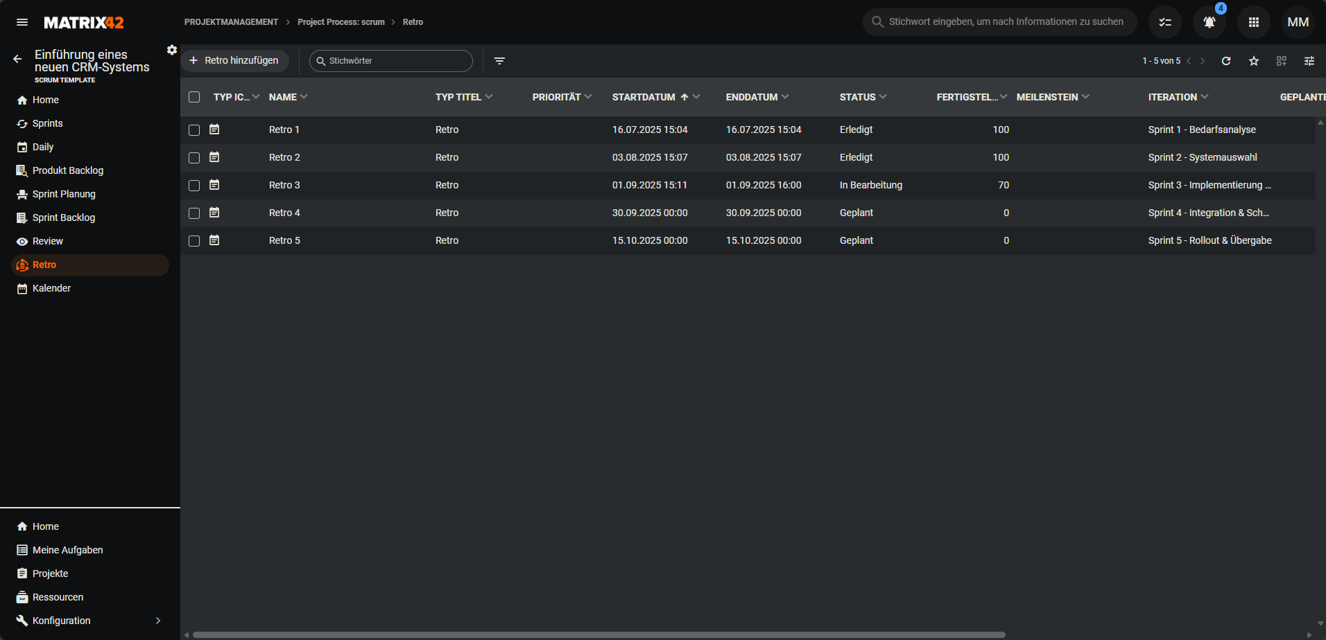 Zeigt die Retros des Projekts in einer tabellarischen Grid-Ansicht oder in einer Kalenderansicht an.