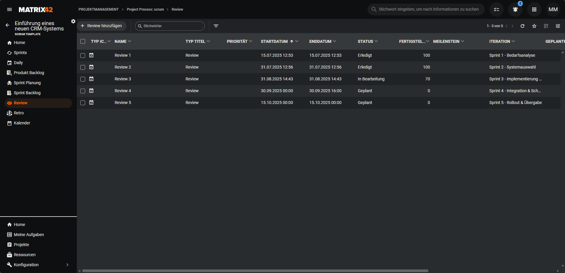 Unter Review findest du alle Besprechungen innerhalb des Projekts. Du kannst zwischen den Anzeigeoptionen tabellarische Grid-Ansicht und Kalenderansicht wechseln.