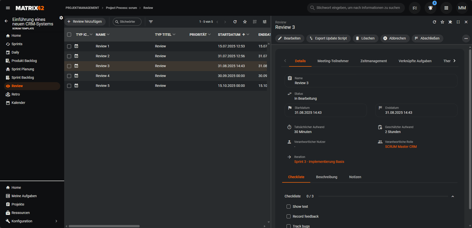 Das Review ist eine Besprechung, die am Ende eines Sprints stattfindet und der Vorstellung sowie Abnahme der erzielten Ergebnisse dient. Im Dialog eines Reviews wird der Name standardmäßig mit Review - vorbefüllt.