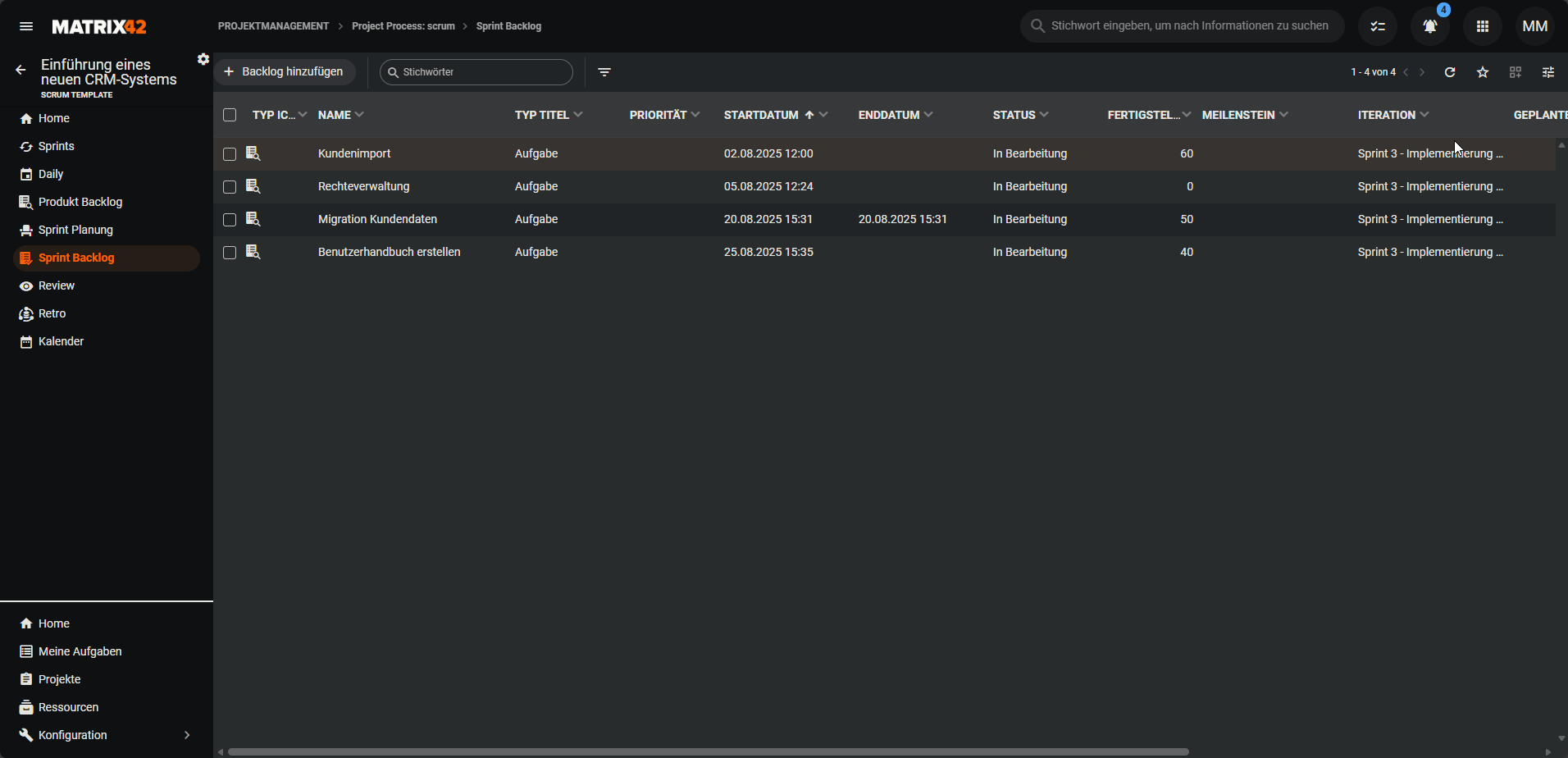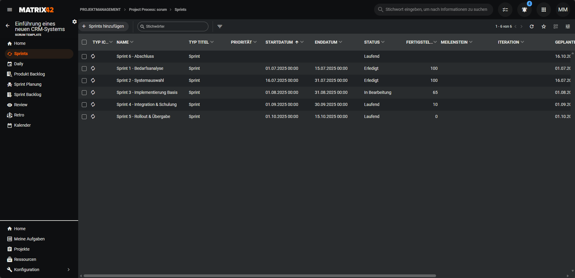 Bietet einen Überblick über die Sprints und zeigt diese in einer tabellarischen Grid-Ansicht an.