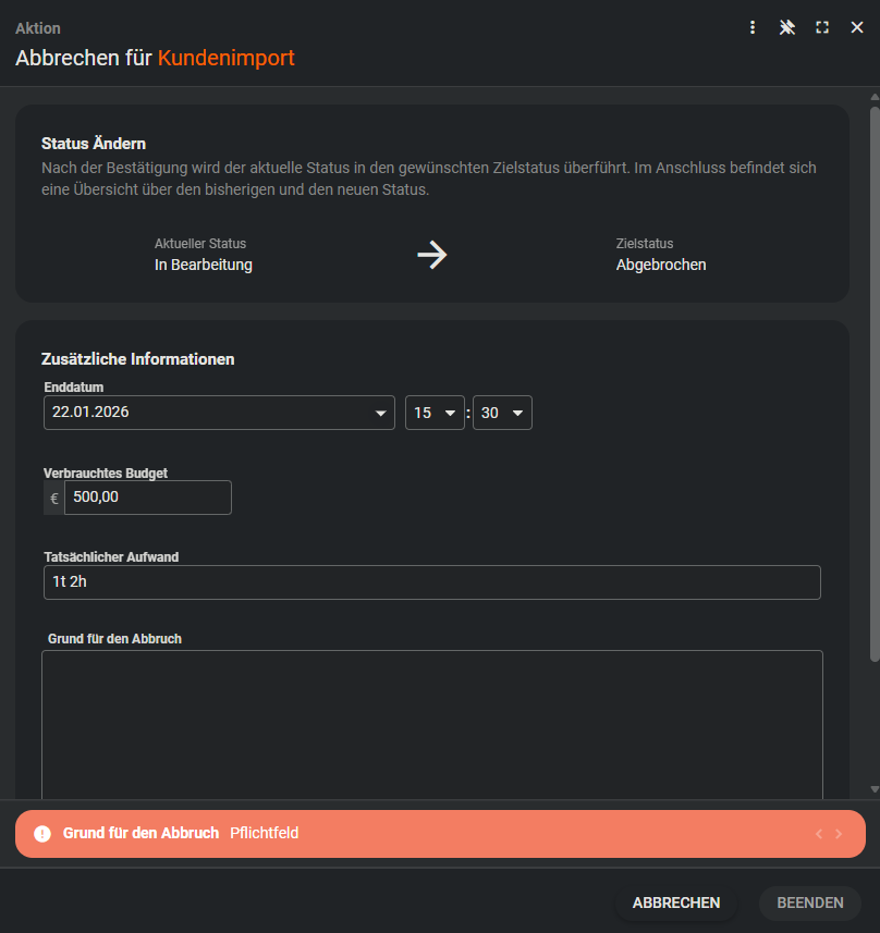 | Begründung des Abbruchs | Text |