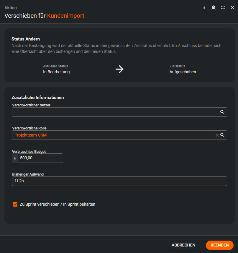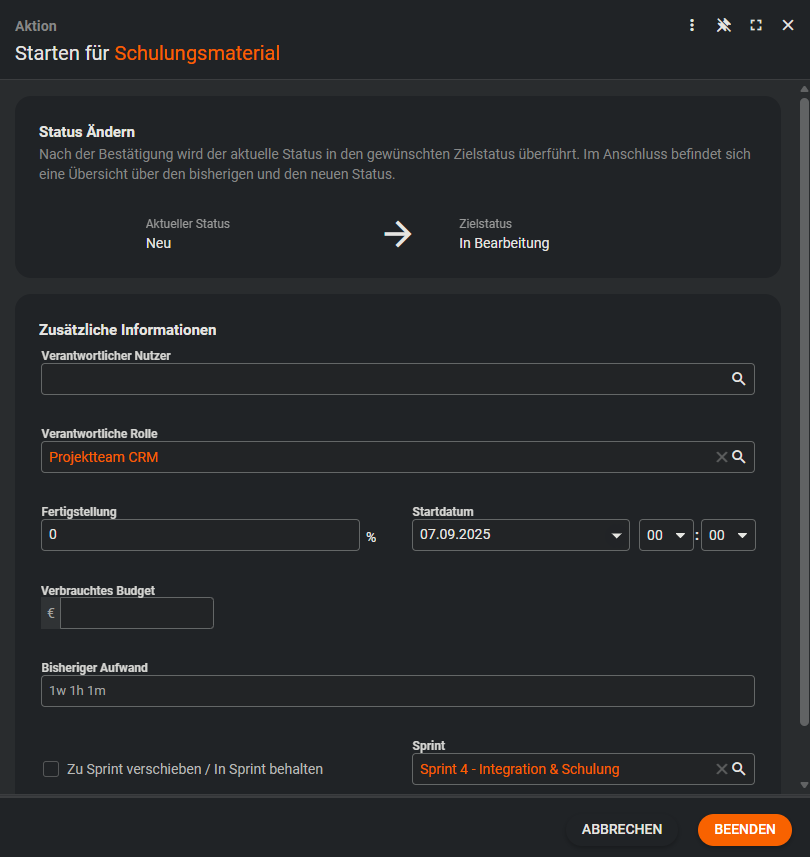 Ein Sprint ist ein fest definierter Zeitraum in SCRUM. Sprints haben eine feste Dauer (meist 1–4 Wochen) und enthalten Planung, Umsetzung, Review und Retrospektive. Ziel eines Sprints ist es, einen klar definierten Mehrwert zu liefern. Im Dialog eines Sprints werden das Start- und Enddatum automatisch vorbefüllt. Dabei wird stets die Zeitspanne des Start- und Enddatums des zuerst erstellten Sprints verwendet.