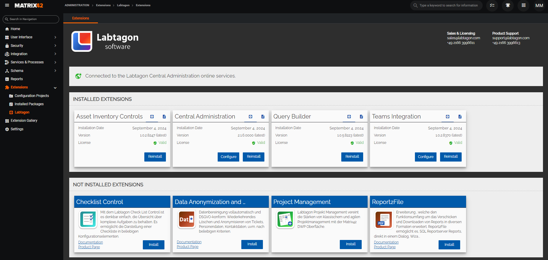 Erweiterungen von Labtagon lassen sich denkbar einfach installieren. Lade dir dafür die Central Administration herunter und folge der Installationsanleitung zur Einrichtung des Tools. Mit der Central Administration lässt sich dann die gekaufte Erweiterung per Knopfdruck installieren.