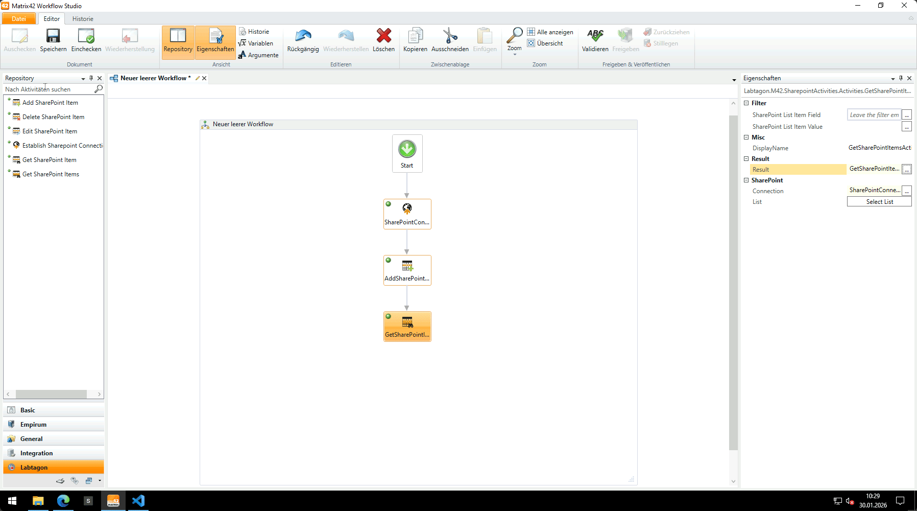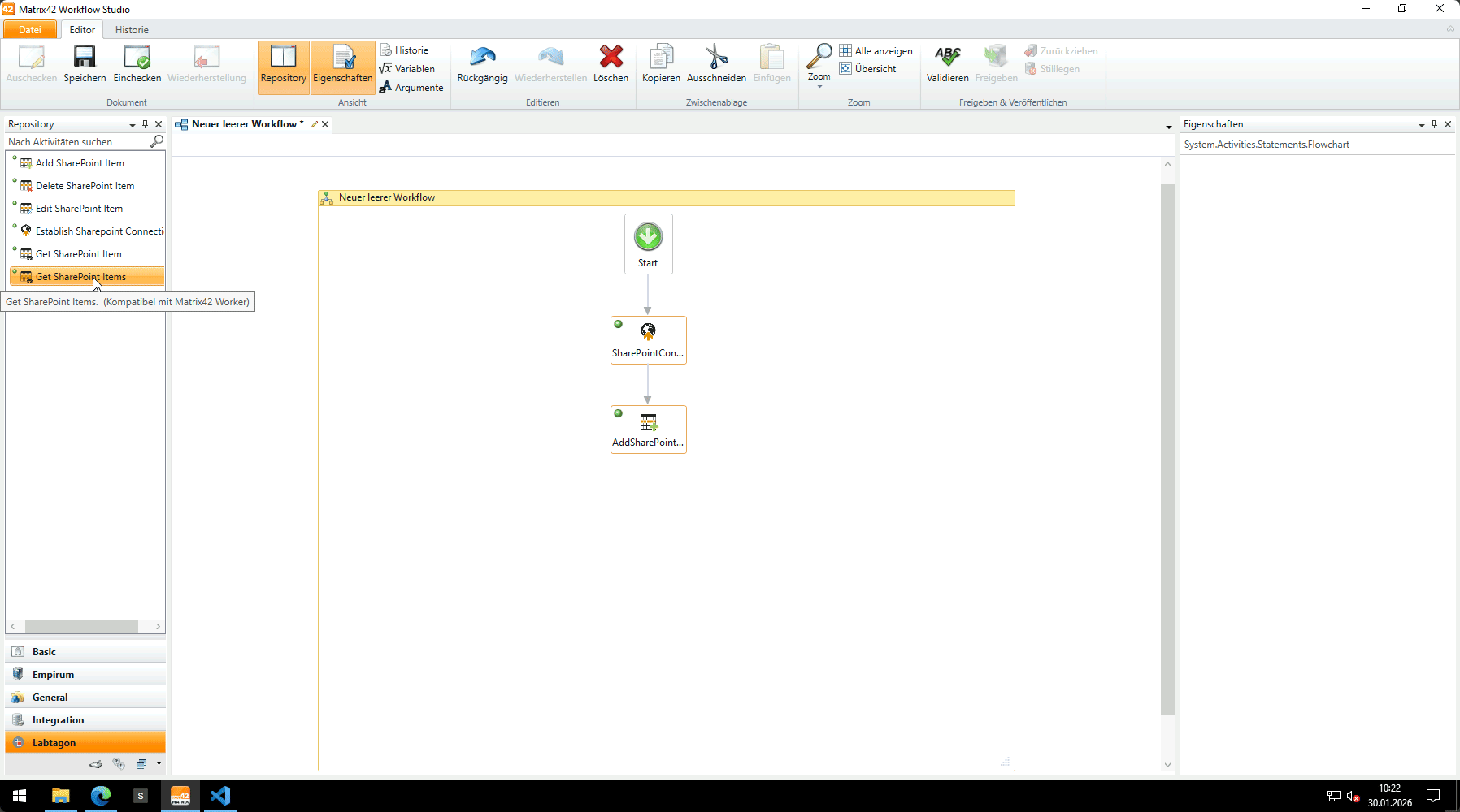 - Füge die Workflow Aktivität Establish SharePoint Connection hinzu: